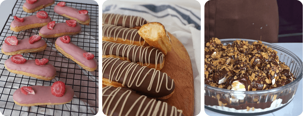Разберём нюансы приготовления идеального заварного теста и научимся готовить эклеры и профитроли. Вас ждут ванильный эклер в шоколаде, клубничный вариант и профитрольный торт в форме — нежно, стабильно, красиво.